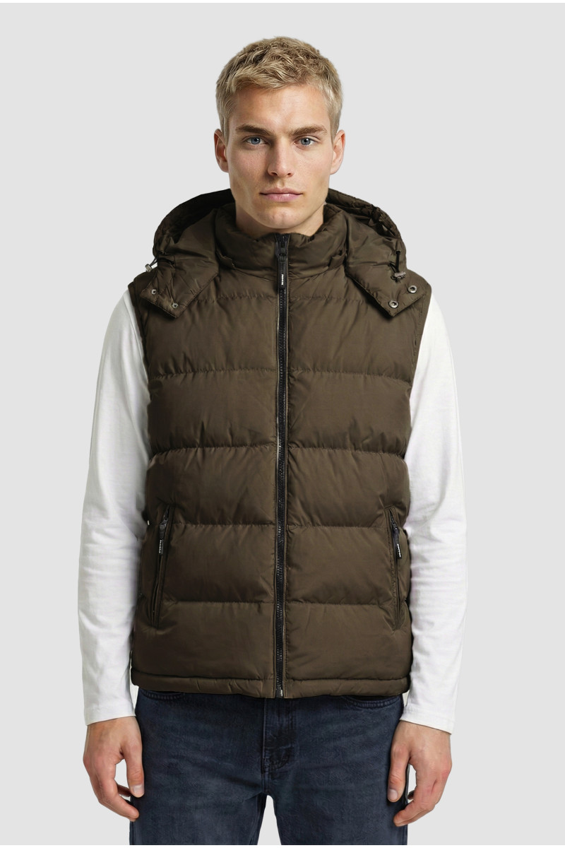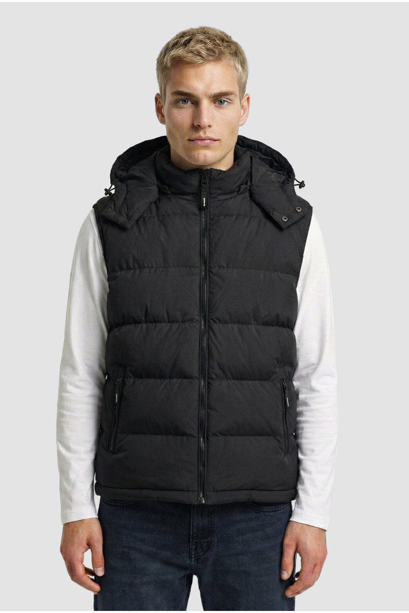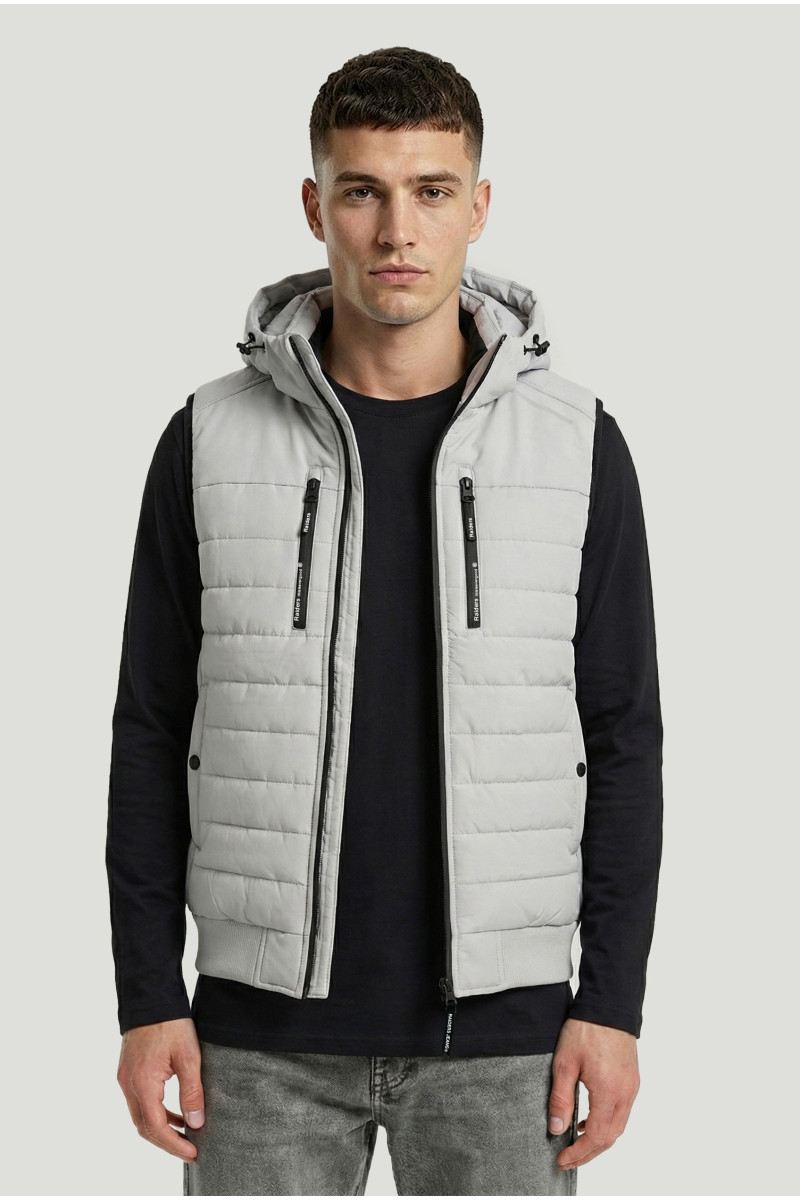 Descripción: Chaleco bastones anchos con capucha desmontable. Logo estampado en goma al tono. Doble tiracierres.