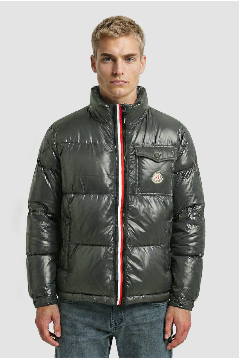 Descripción: Campera bastones anchos brillante, con doble cierre y abertua central con cinta tricolor. Bolsillo frente con escudo y broches con logo. Doble tiracierre.