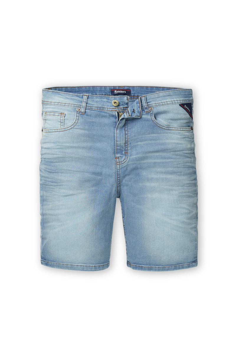 Bermuda con calce amplio. Tejido índigo Azul. Relojero con marca. Lavado en tono claro con arrugas 3D.