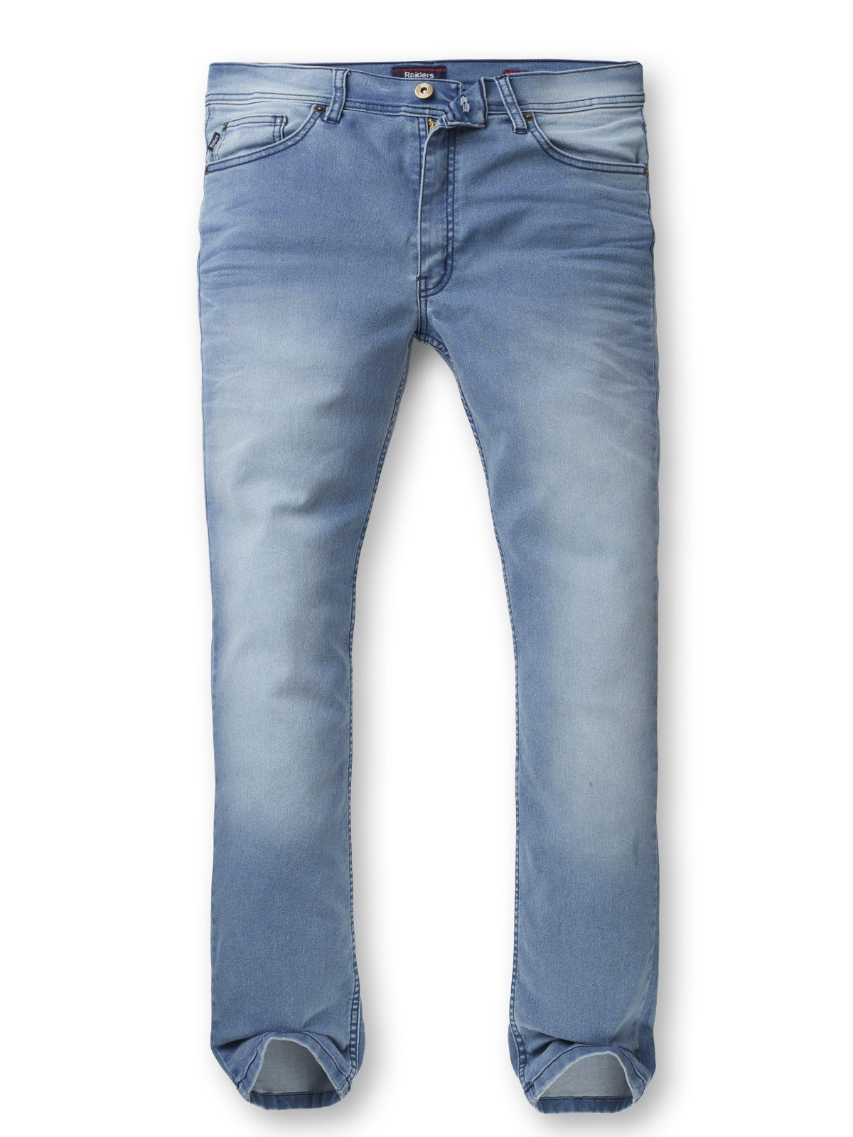 Jean Calce Amplio, pierna recta, bota mas ancha. Cartera con cierre. Lavado en tono claro, localizado con bigotes 3D.