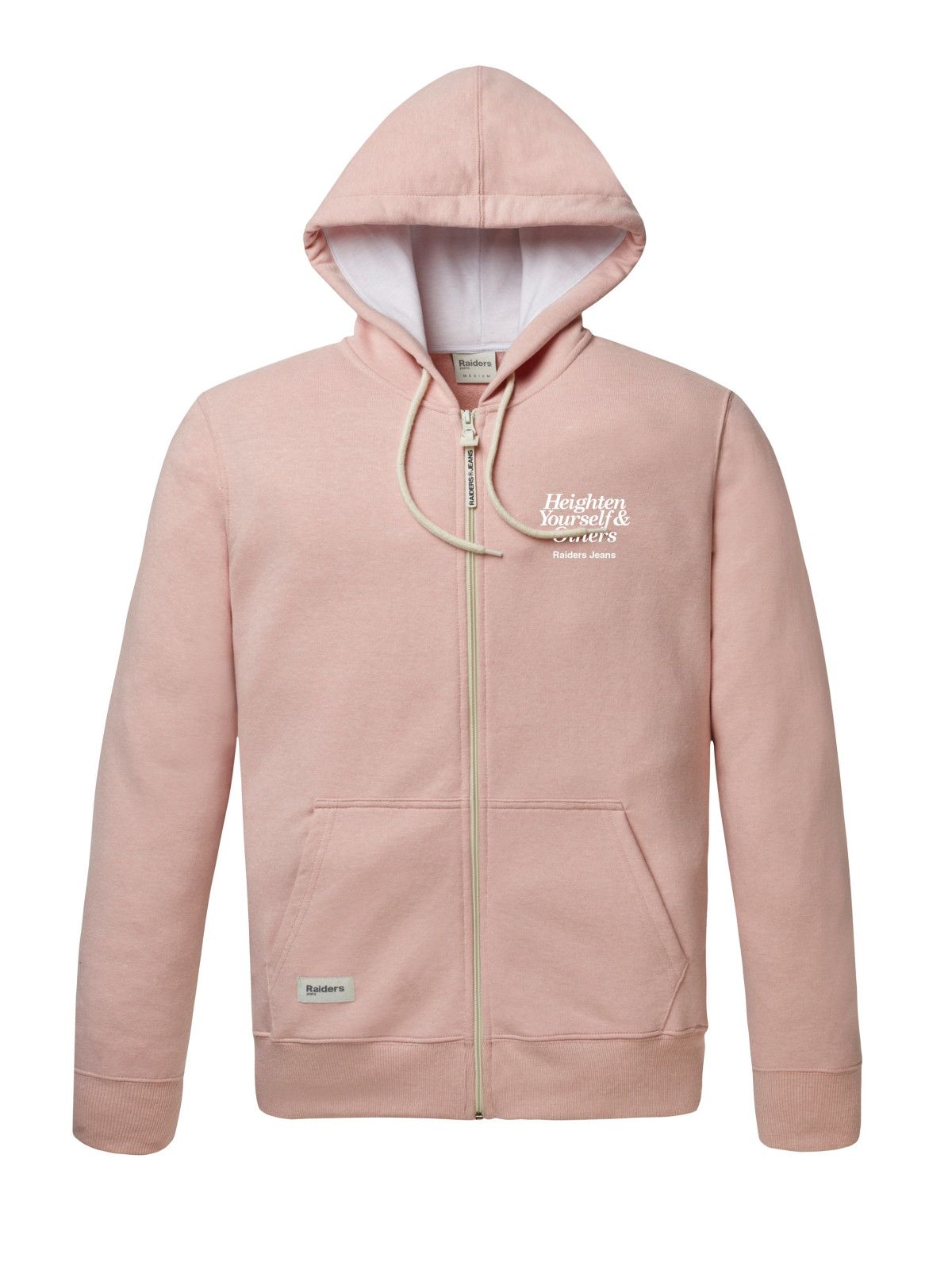 Campera con cierre en rustico melange. Lleva combinado en color crudo los cordones, cierres, forros de capucha y estampa tipo logo.