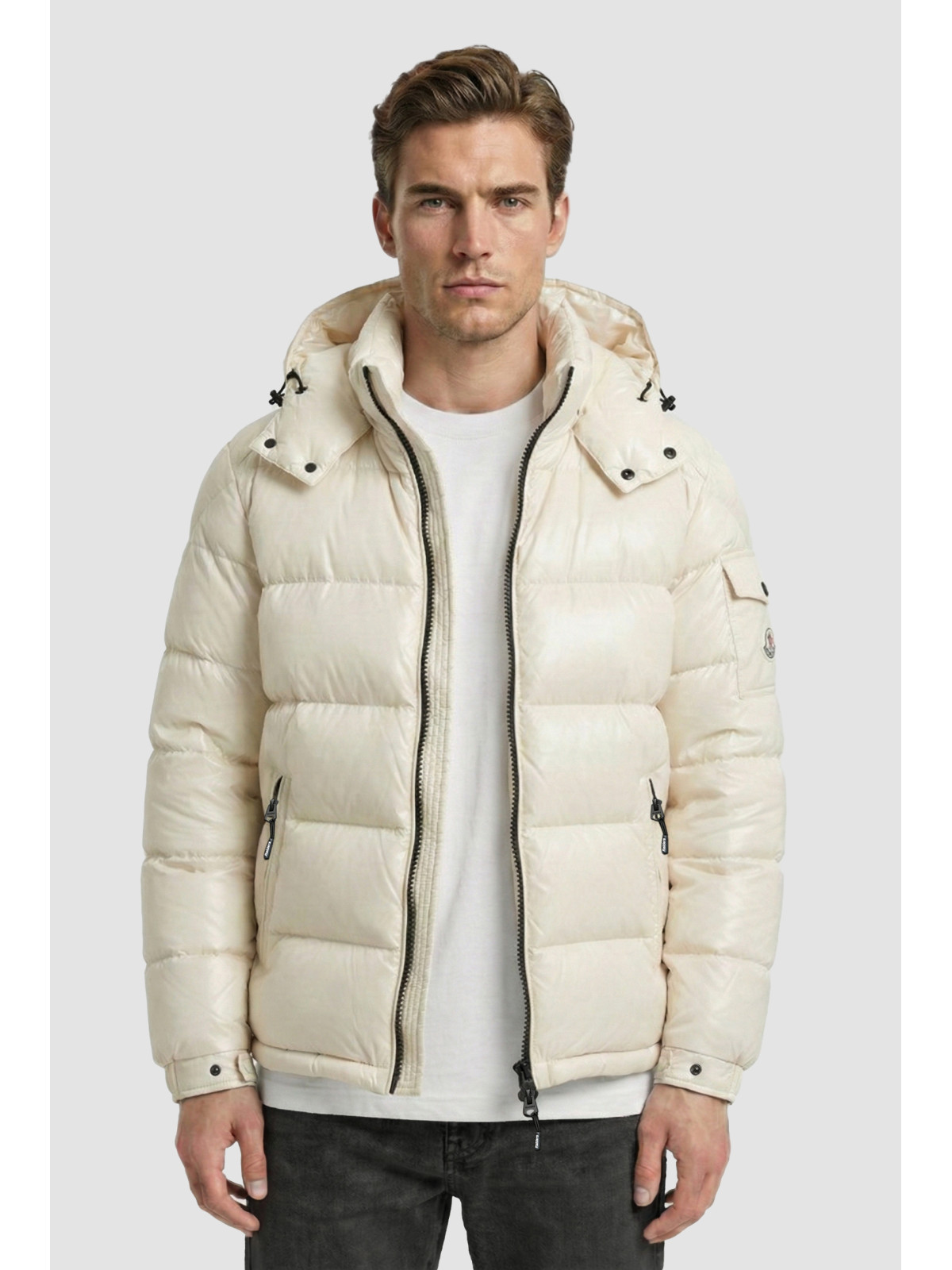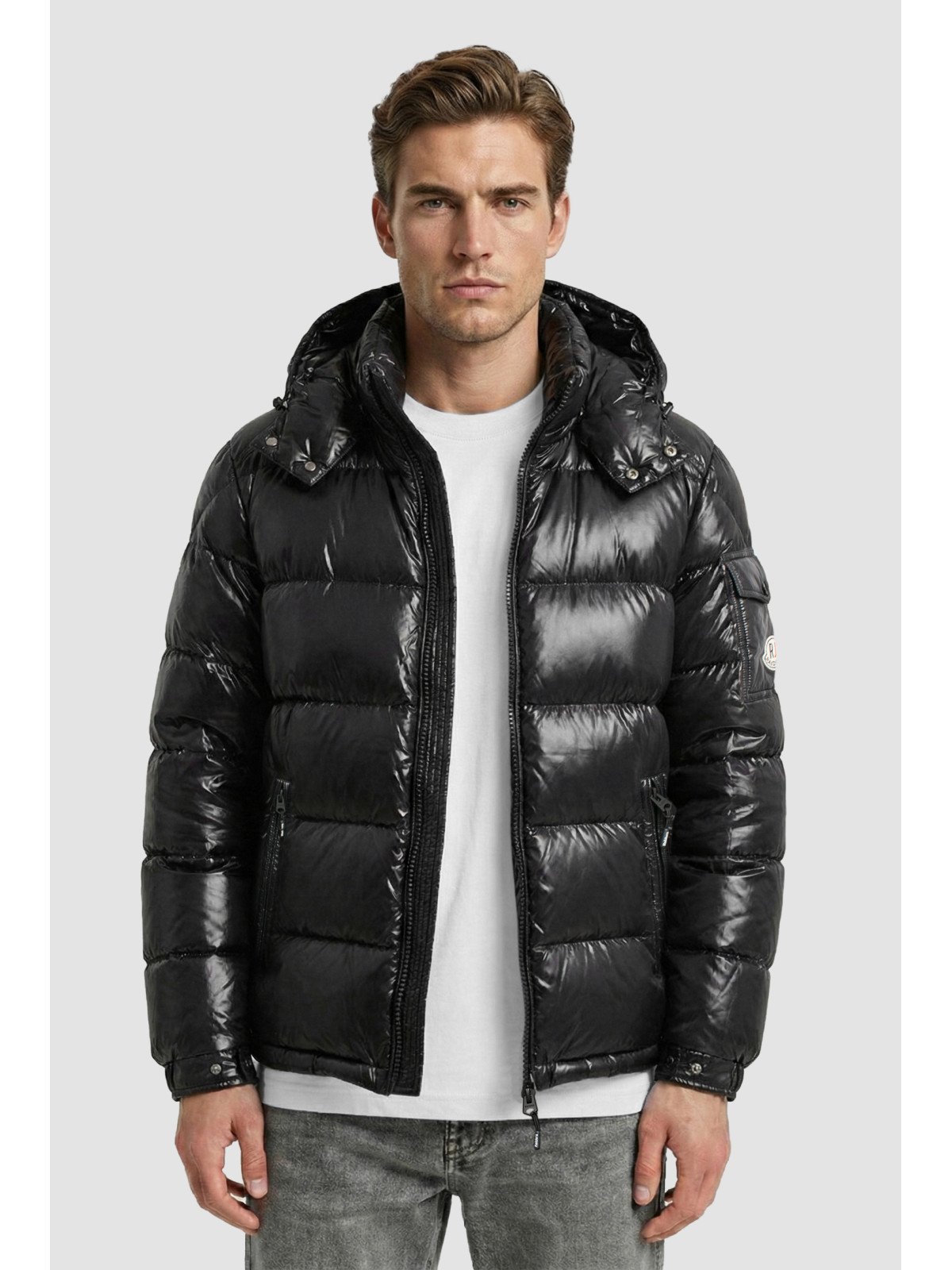 Descripción: Campera bastones anchos brillante, con capucha desmontable. Bolsillo en manga con escudo y broches con logo. Doble tiracierre.