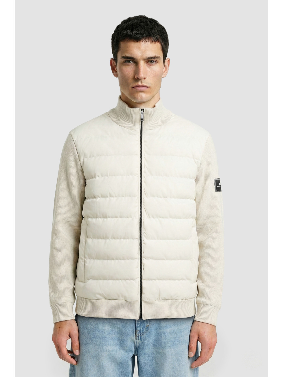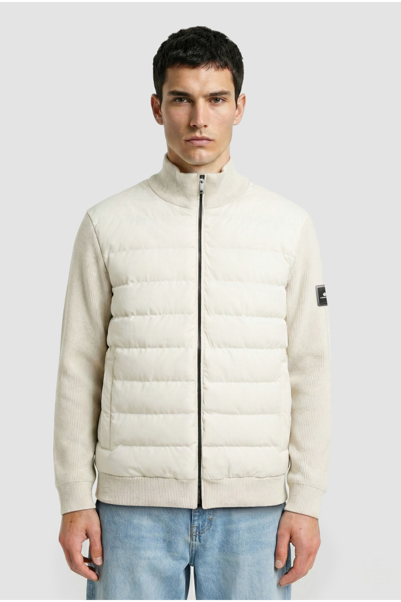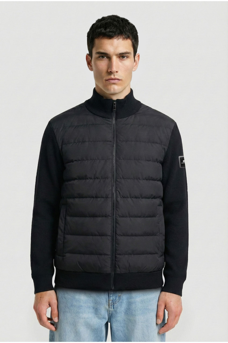 Descripción: Campera combinada con mangas y espalda con tejido menguado. Cuerpo matelase. Escudo en manga con chapa con logo. Cierre y broches metalicos.