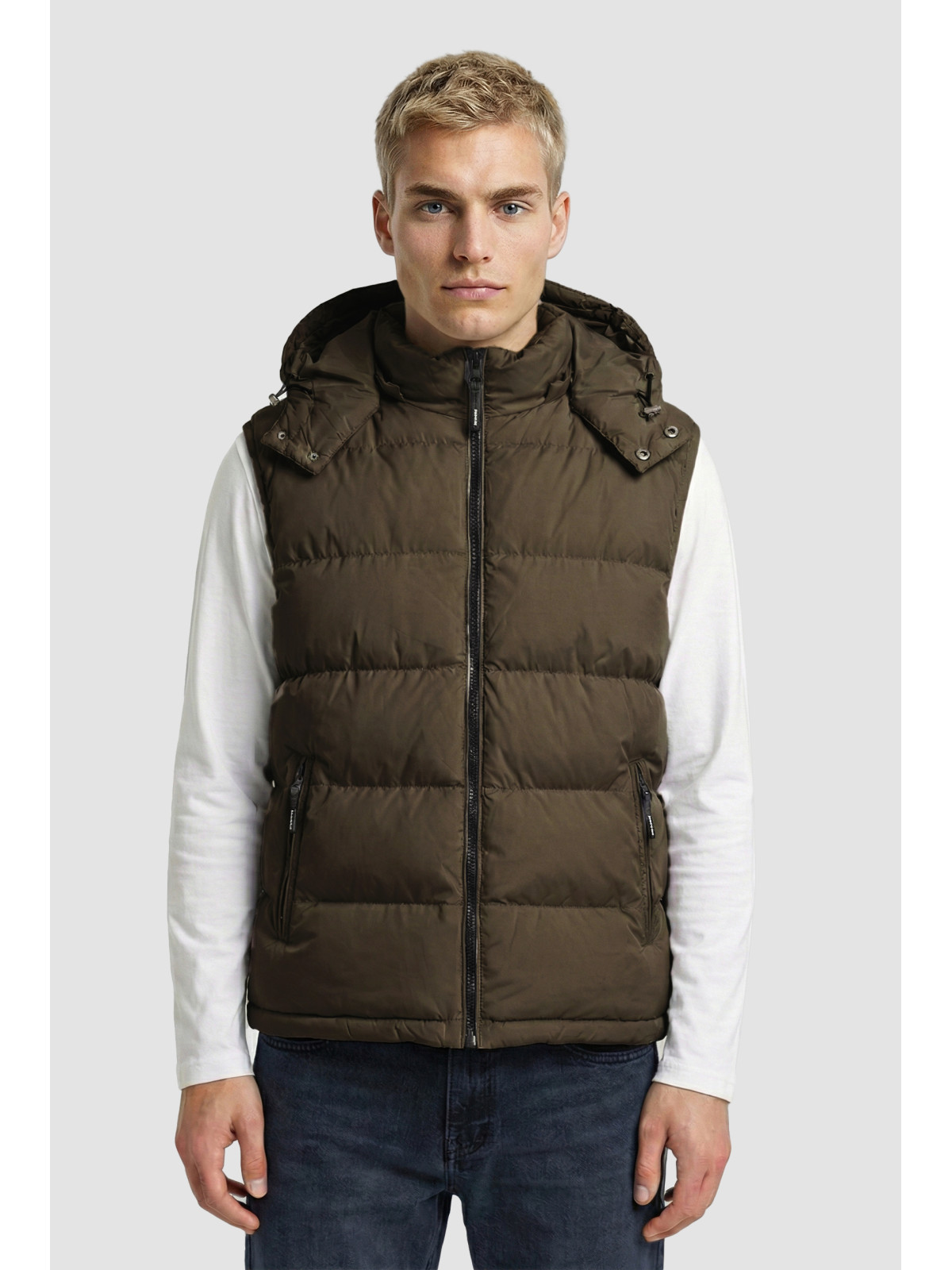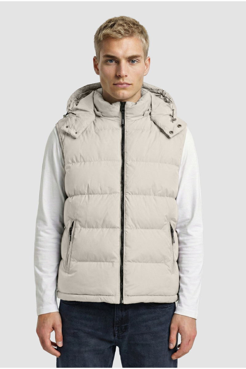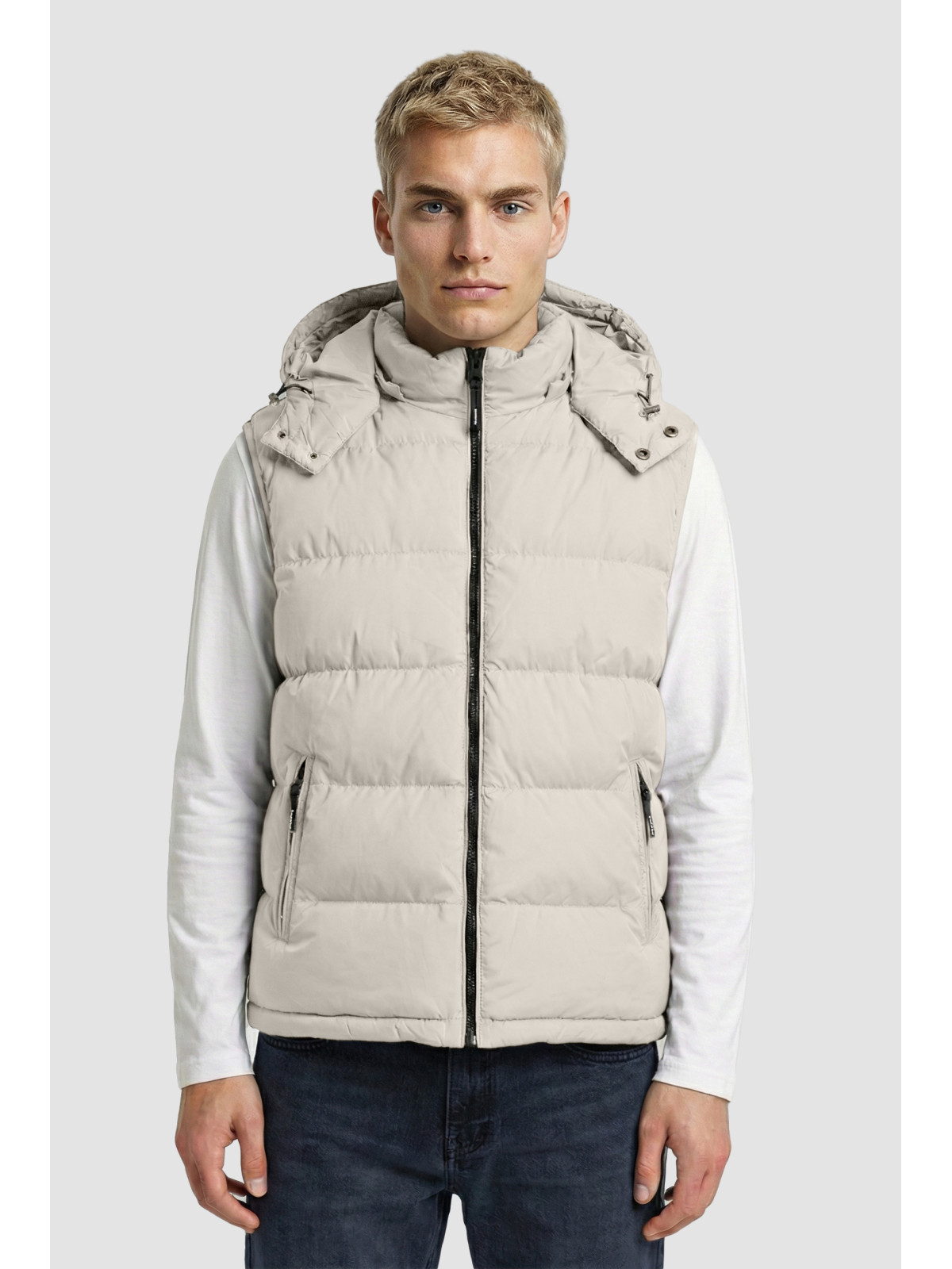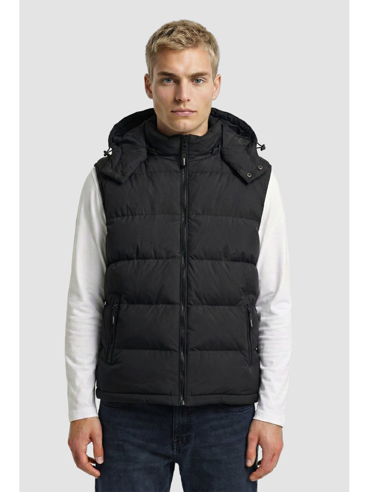 Descripción: Chaleco bastones anchos con capucha desmontable. Logo estampado en goma al tono. Doble tiracierres.