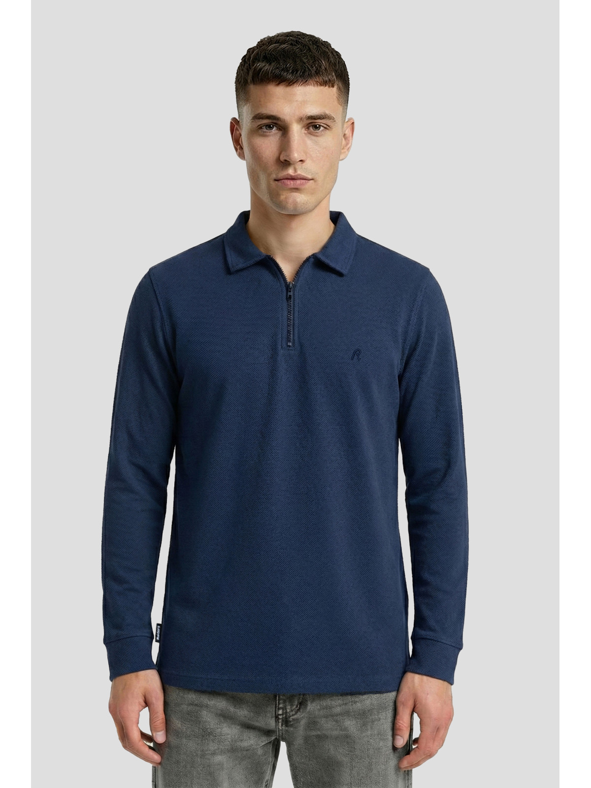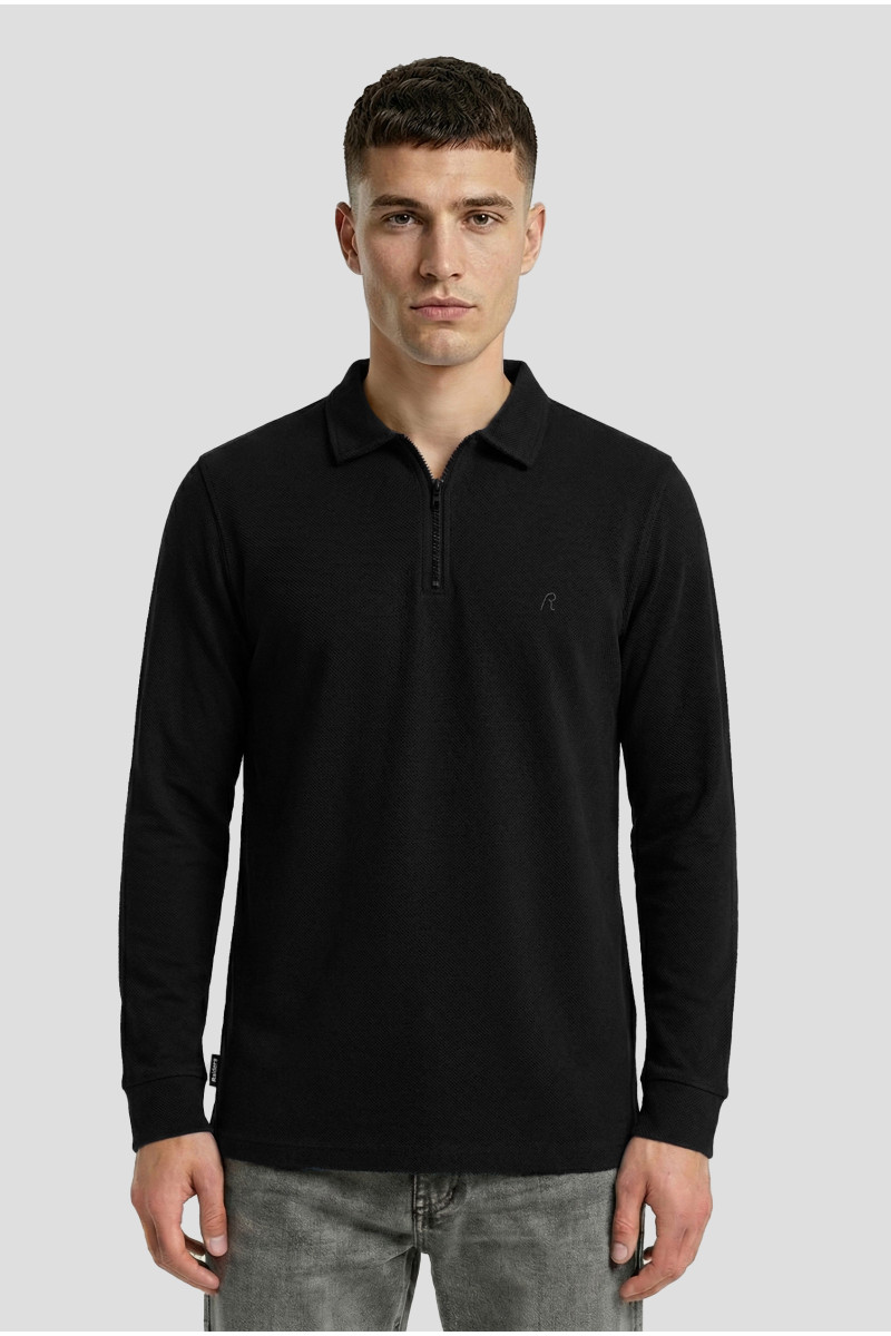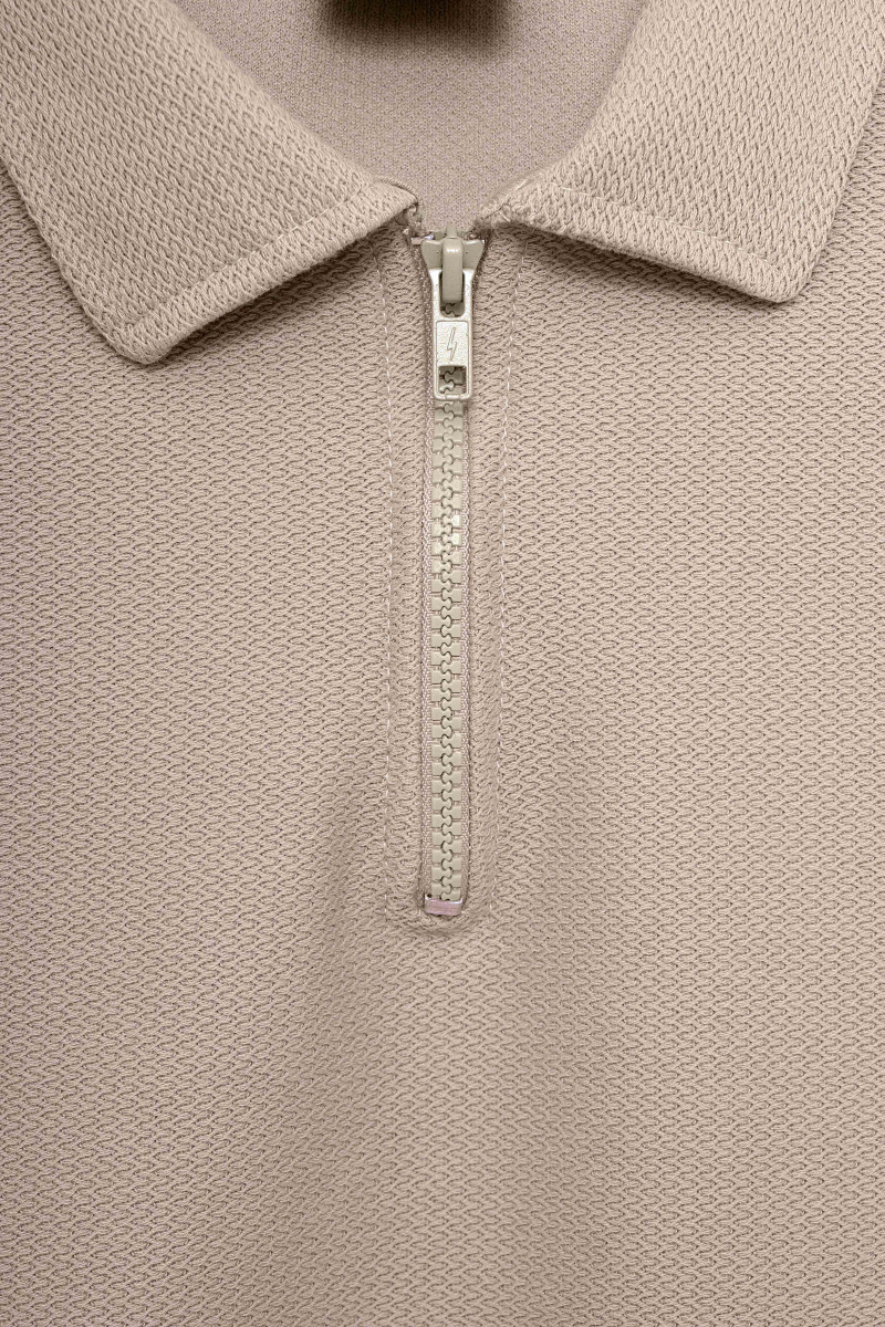 Descripción: Chomba con cierre en textil diferenciado Rústico espigado. Logo bordado al tono.