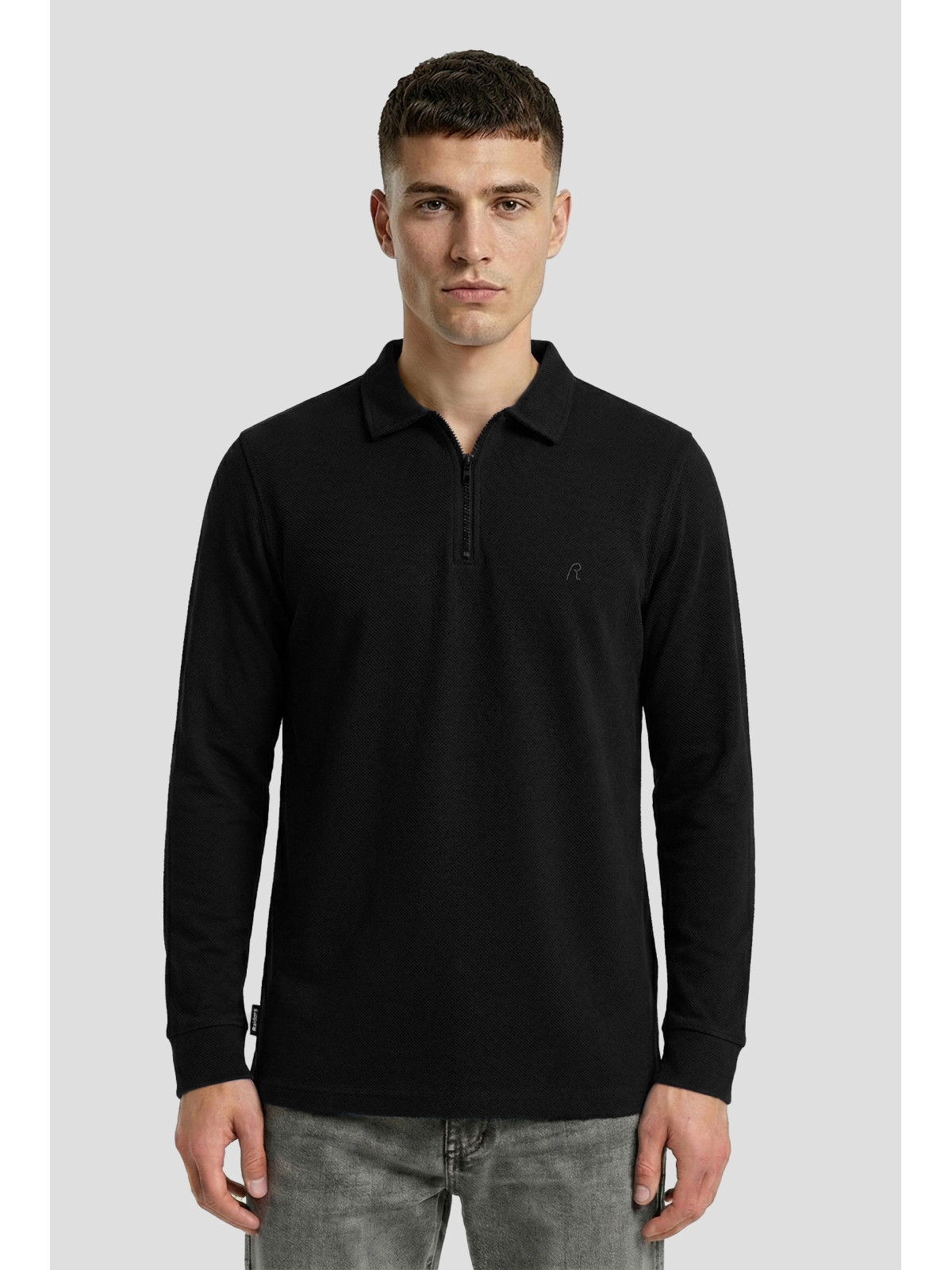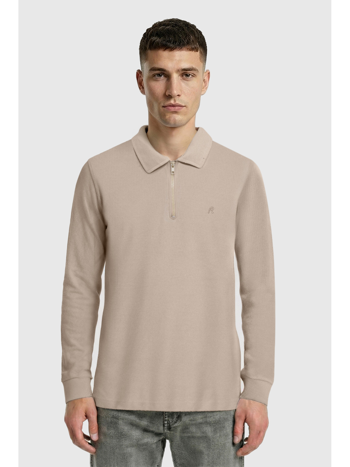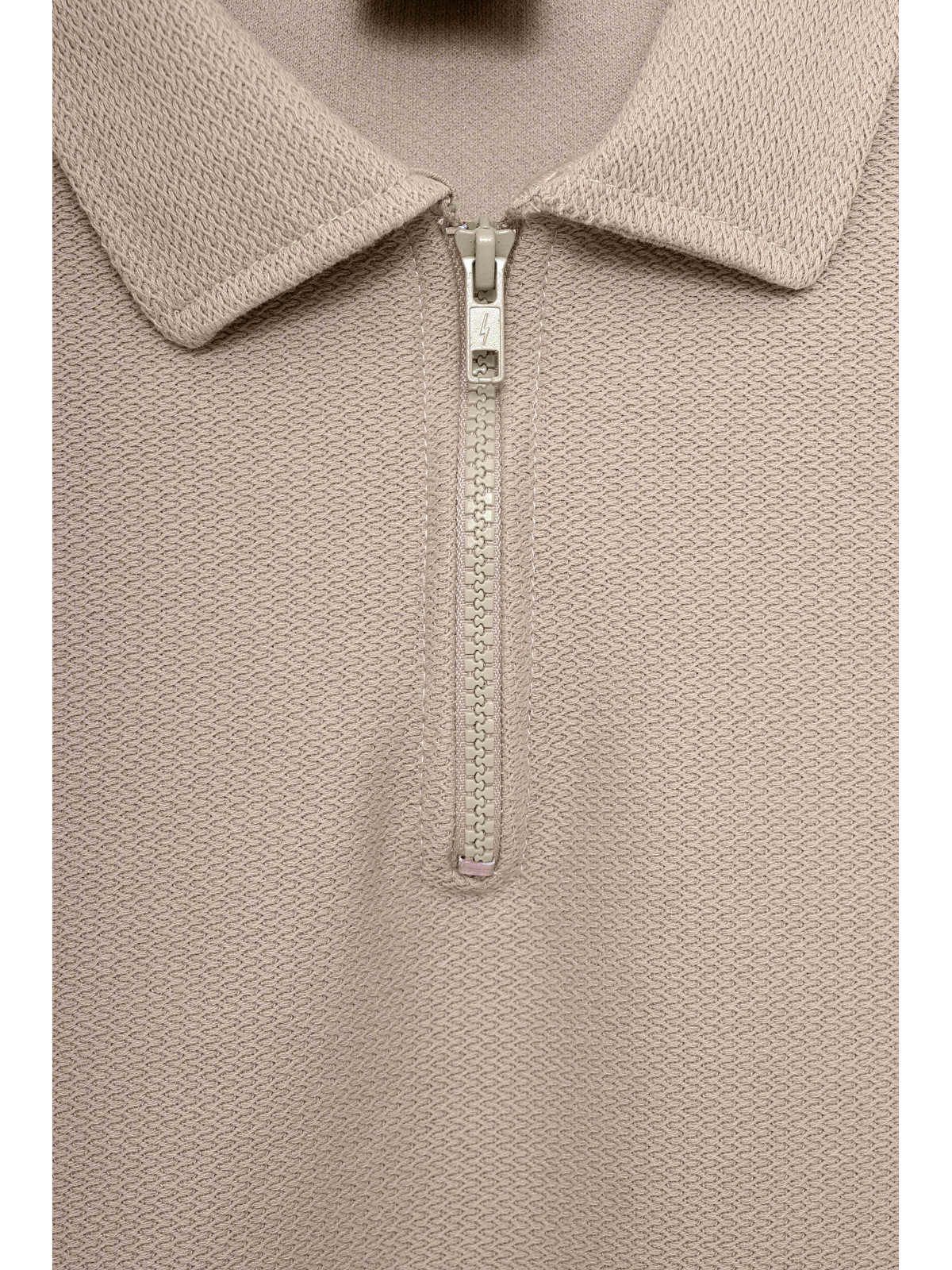 Descripción: Chomba con cierre en textil diferenciado Rústico espigado. Logo bordado al tono.