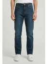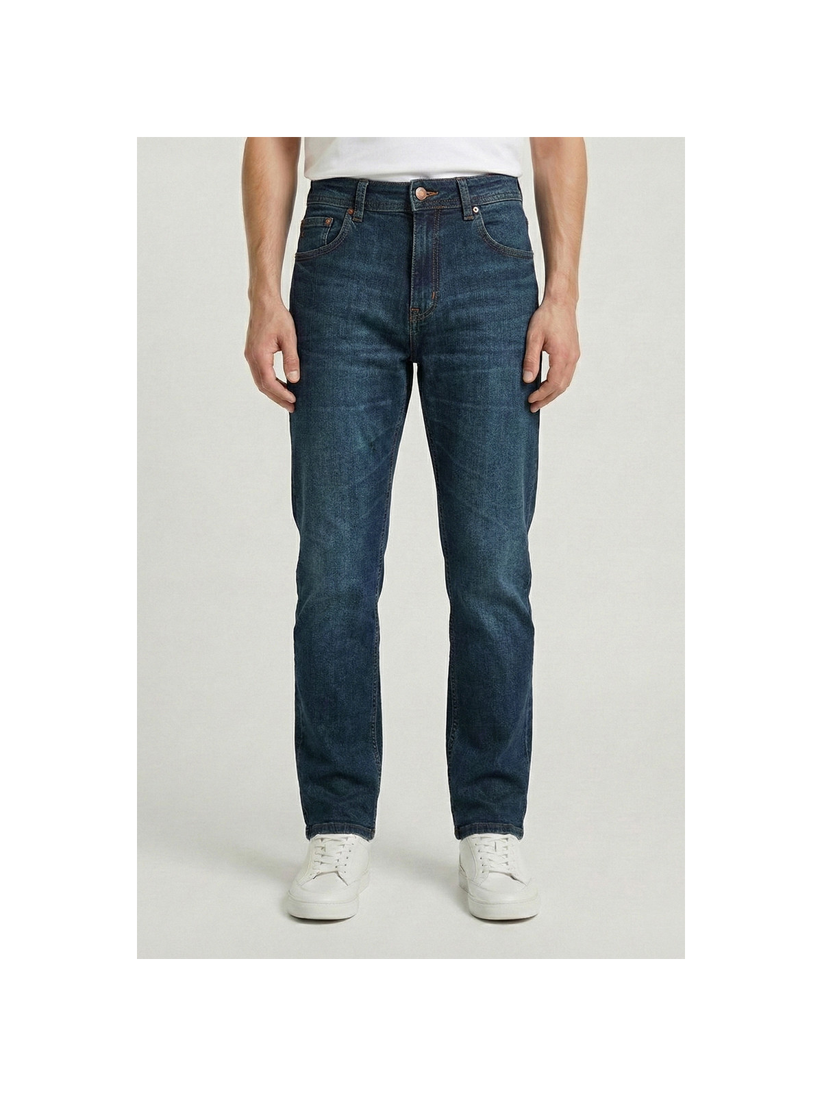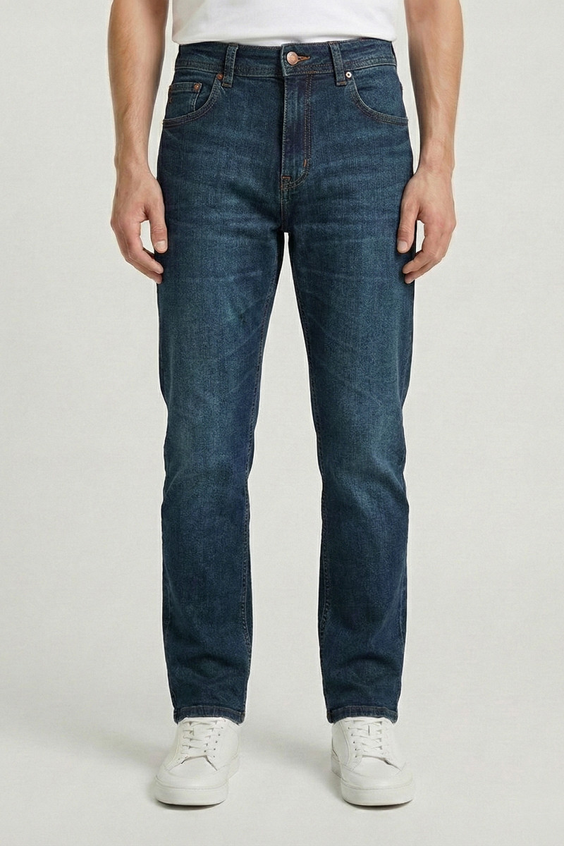 Descripción: JJean modelo recto tiro alto . Lavado en tono oscuro, localizado. Chapita R en bolsillo relojero.