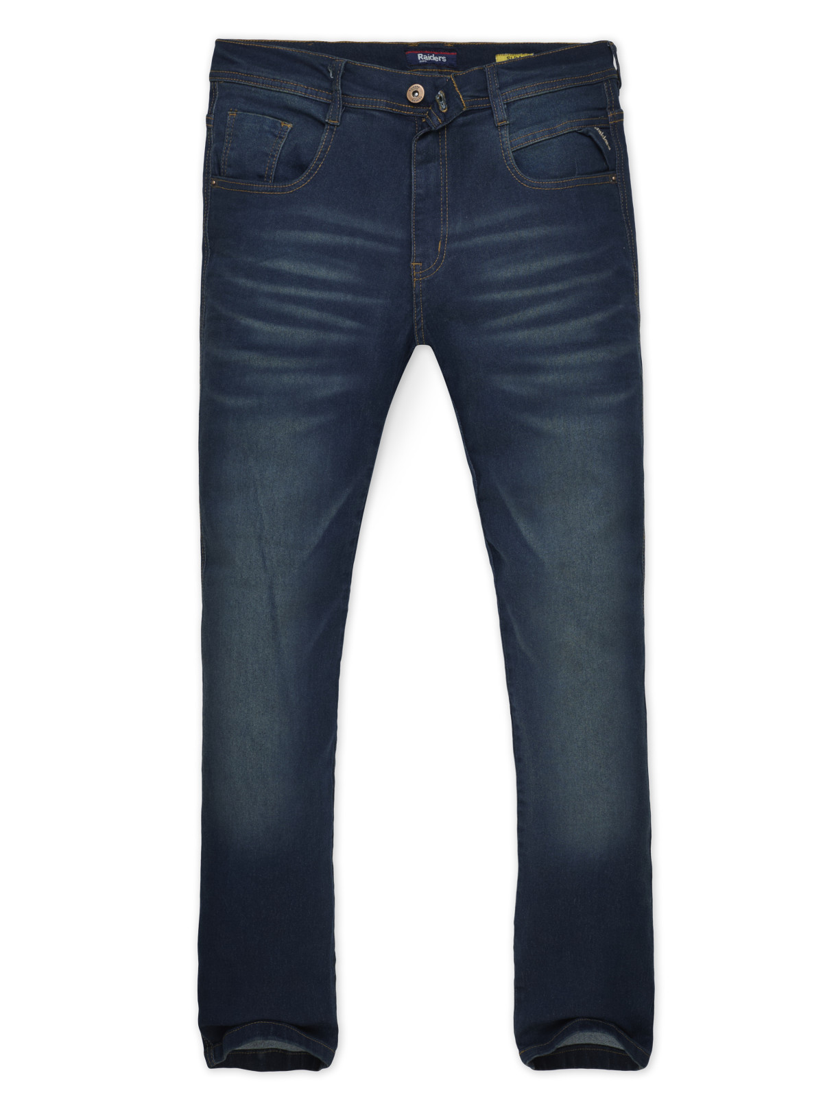 Jean modelo Anbass . Lavado con tono oscuro, bigotes, localizado y matizado mas arrugas 3D. Bordado Raiders en el triangulo lateral.