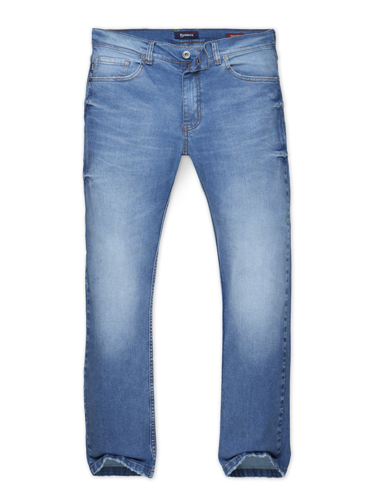 Jean modelo 411 . Lavado en tono medio, localizado con sunchos laterales más arrugas 3D.