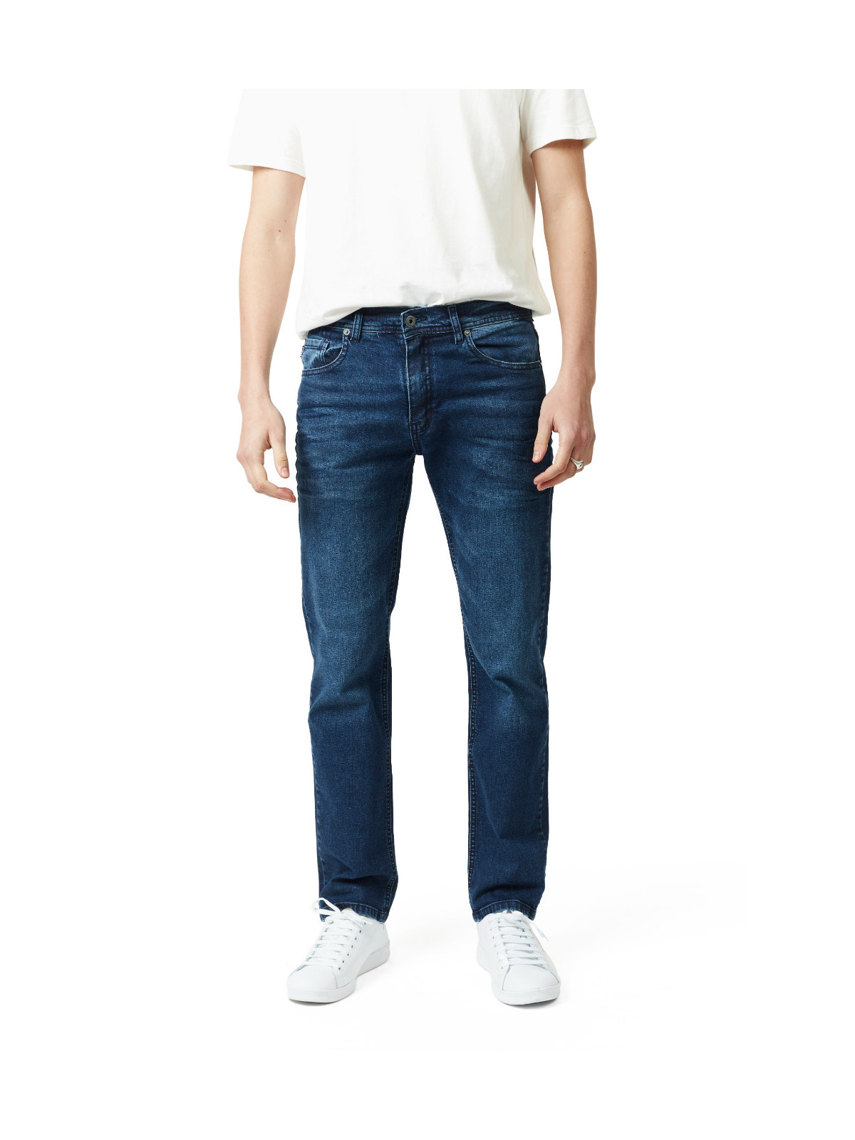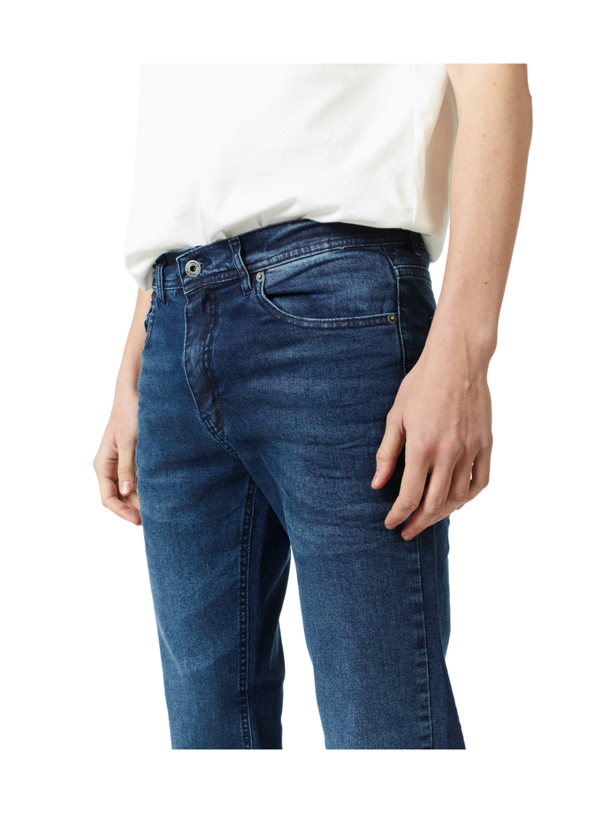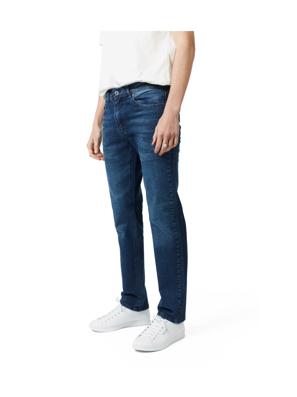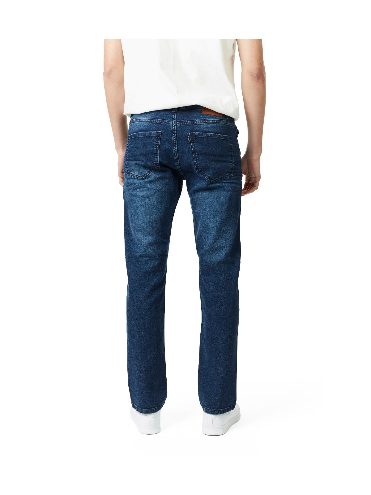 Jean Calce Recto, bota mas ancha. Cartera con cierre. Lavado en tono oscuro, localizado con bigotes 3D.