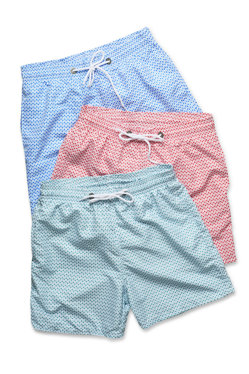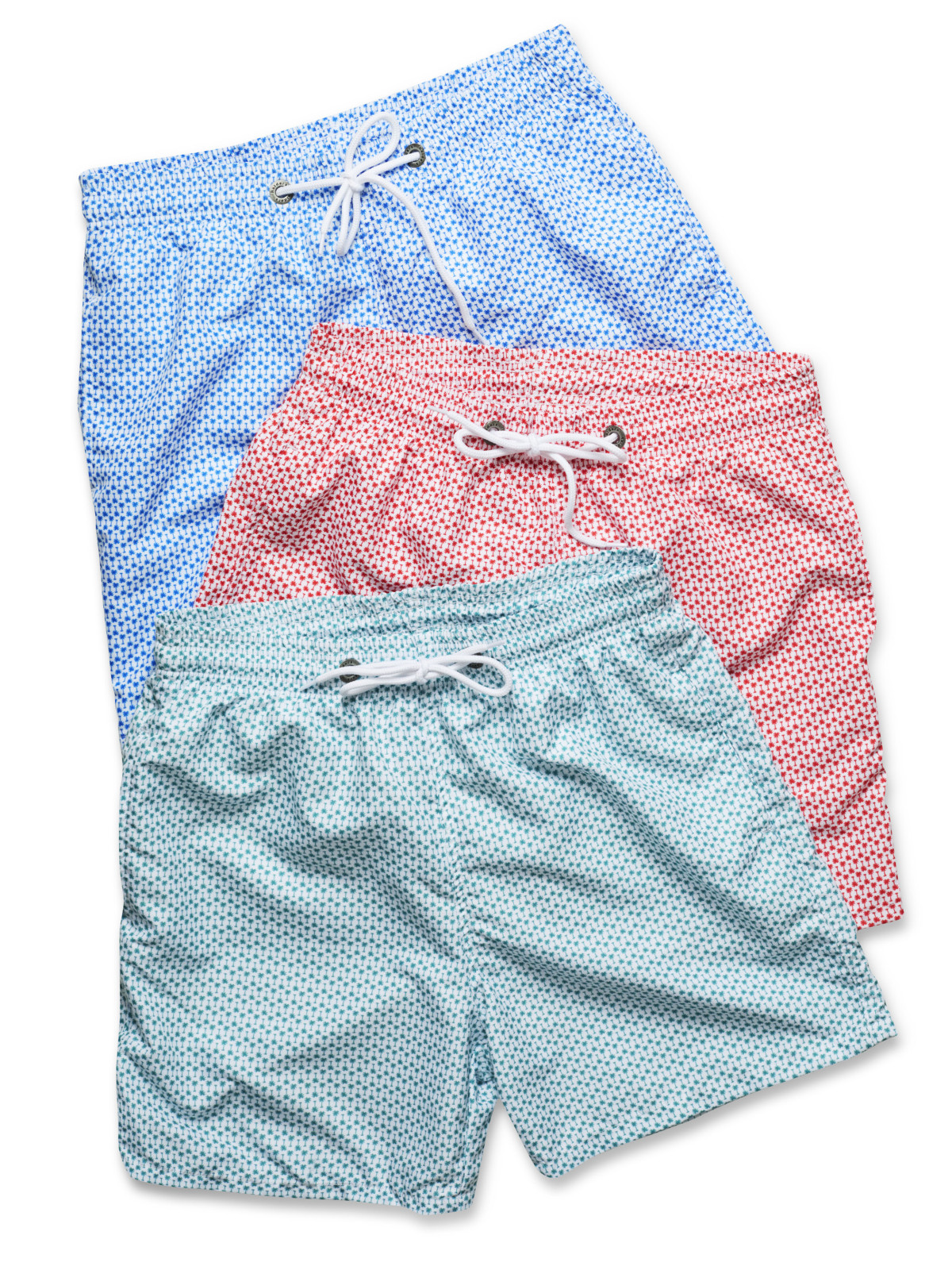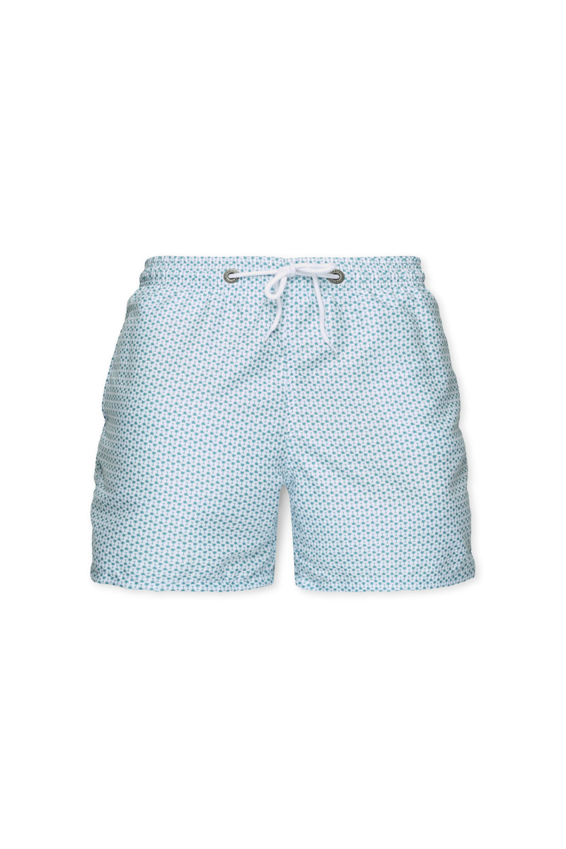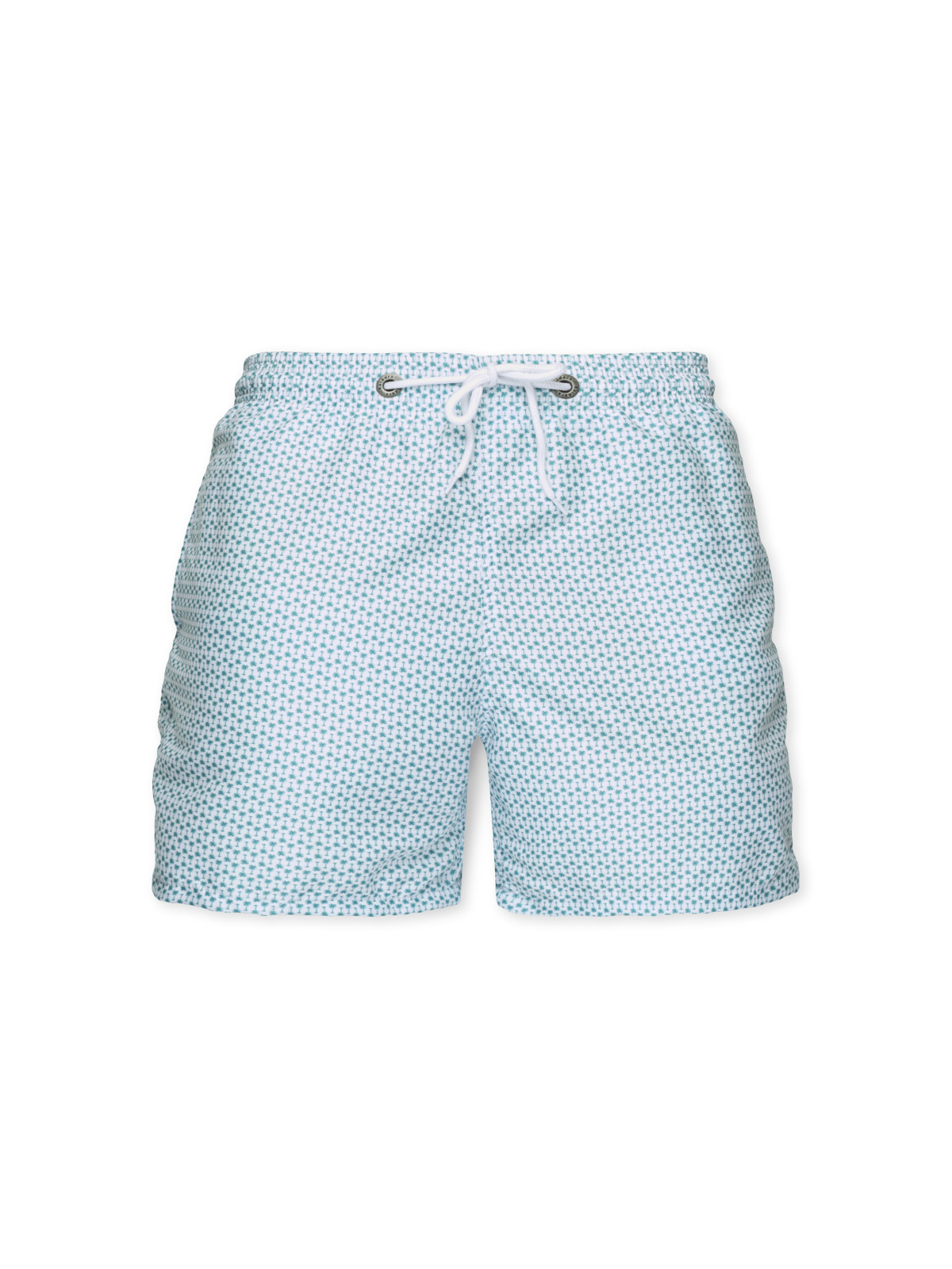 Short de baño sublimado con dibujo de pequeñas palmeras.