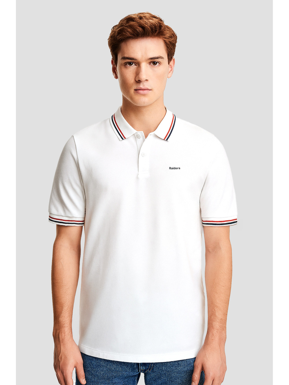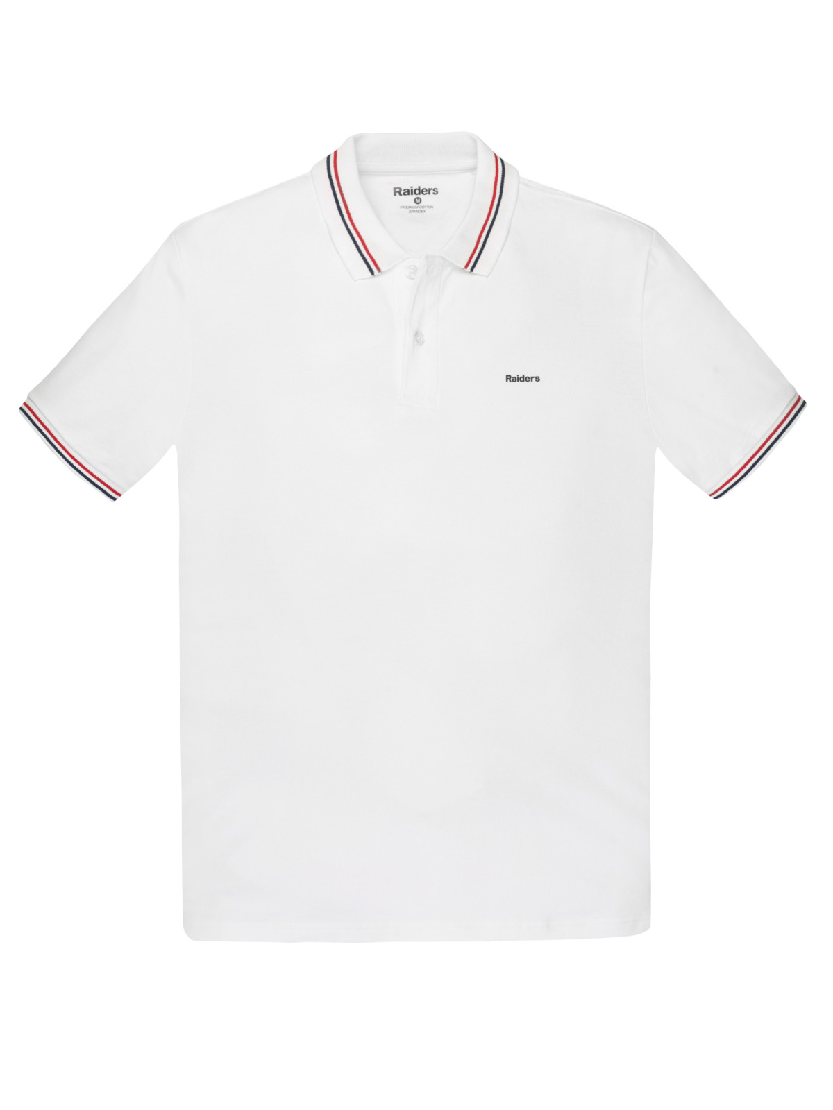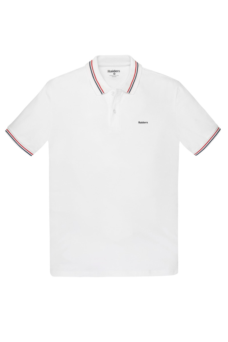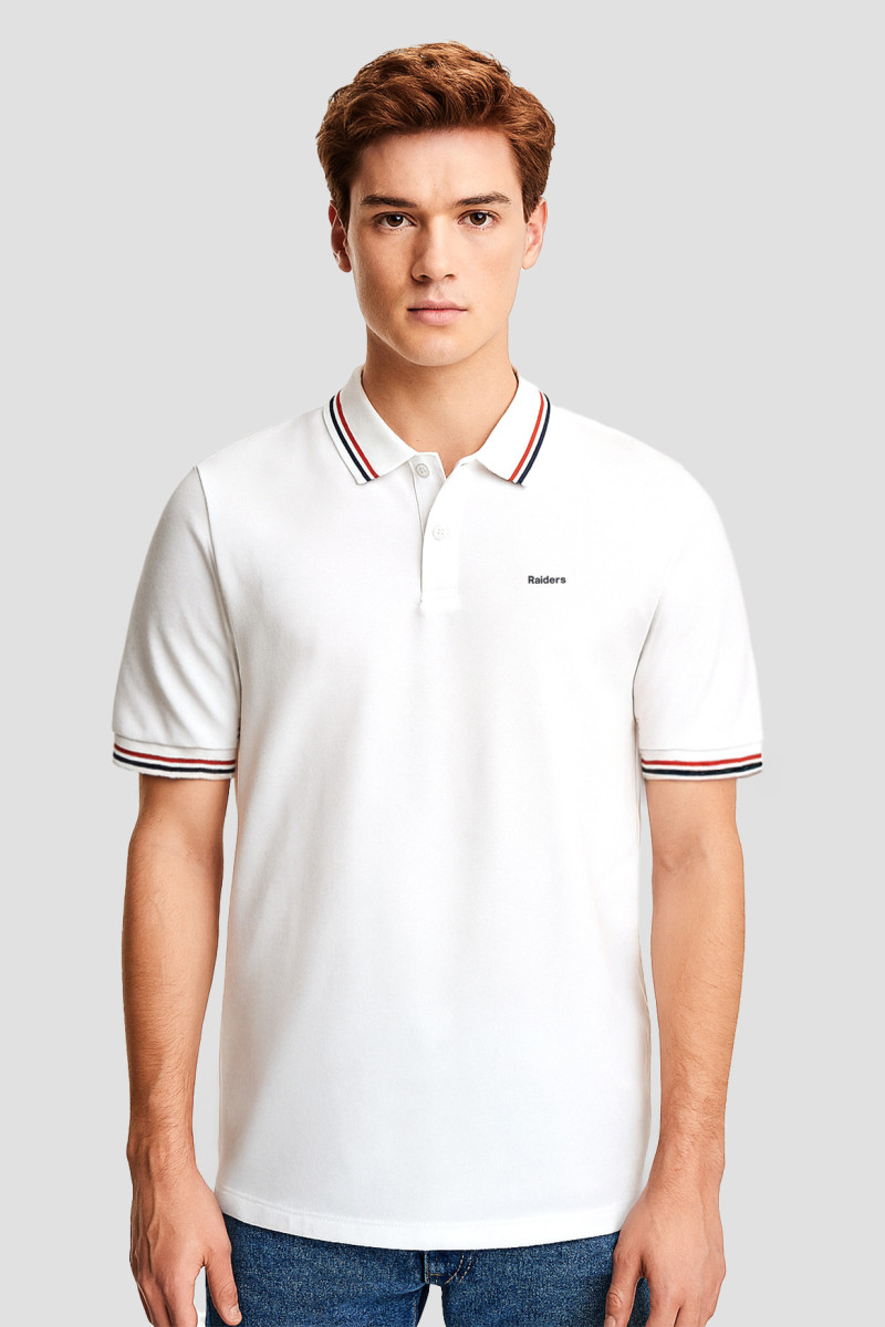 Chomba en Micropique con Spandex cuellos y puños con raya bicolor fina. Estampa Raiders en inferior trasero del cuello.